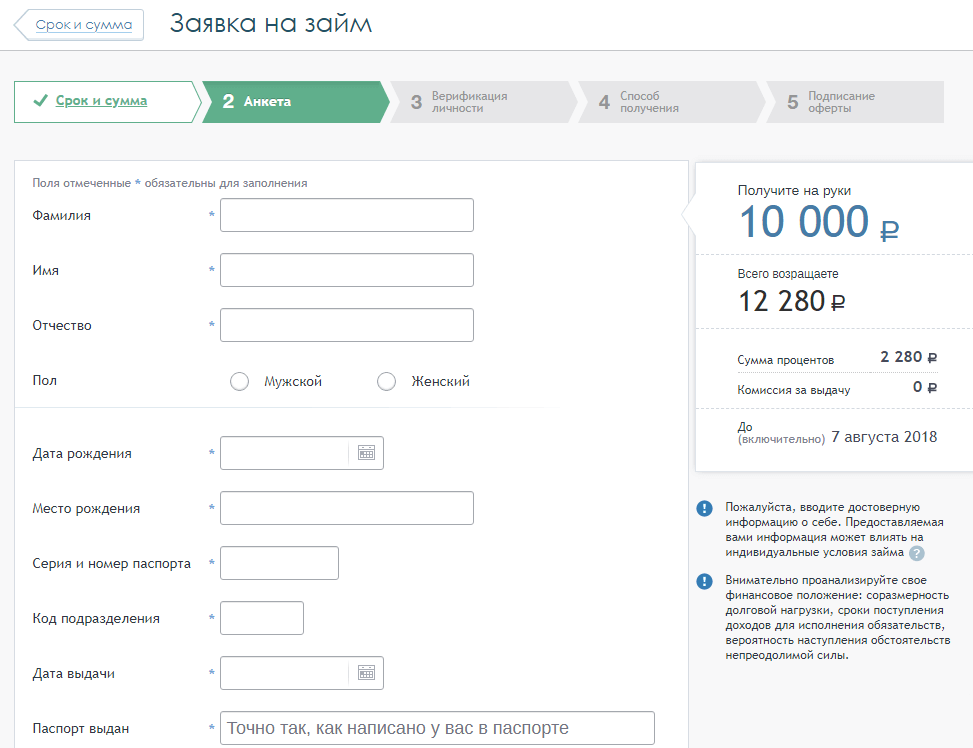 Попадаем на страницу, где предлагается заполнить анкету о себе (заемщике), поля для заполнения следующие:
