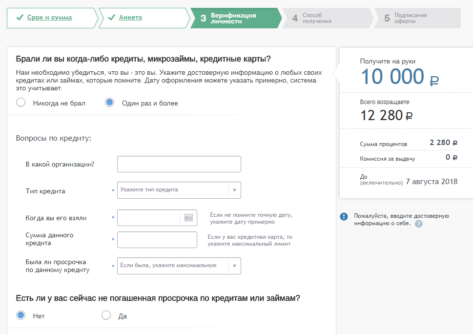 - Проходим верификацию личности (предоставляем информацию о ранее взятых кредитах)
