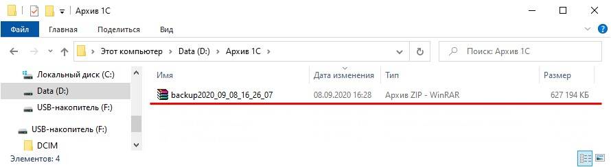 После окончания процесса нужно проверить результат, что цель достигнута. Необходимо посмотреть наличие файла в папке с установленным названием, сверив дату и время его создания. Он будет иметь архивное значение с окончанием *.zip. В дальнейшем при необходимости из этого файла восстанавливаются все данные.