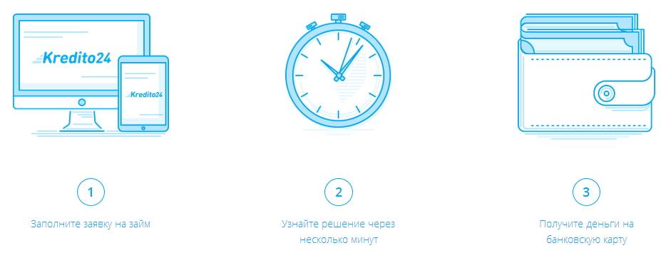 Чтобы получить заем в кредитной организации Kredito24.pro, необходимо корректно указать личные данные, действующий номер мобильного телефона, адрес электронной почты и номер действующей банковской карты. Решение о выдаче займа принимается в течение 15 минут с момента подачи заявки. В случае получения отказа, вы можете повторно подать заявку спустя 24 часа.