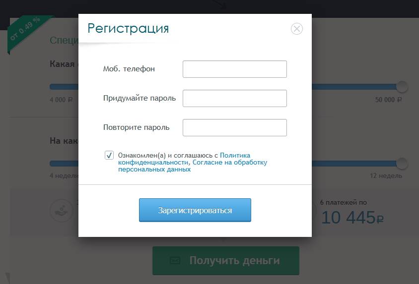 Перед тем, как взять займ, нужно зарегистрироваться на сайте. Для этого требуется ввести номер мобильного телефона и присвоить пароль. Заявка на займ состоит из 5 этапов: