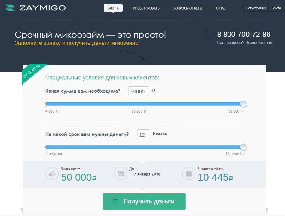 Компания под многообещающим, интуитивно понятным названием Zaymigo, как несложно догадаться, предлагает гражданам получение займов под определённый процент, то есть является по роду своей деятельности микрофинансовой организацией. Возвращать при этом приходится больше, чем было взято изначально. Особо подчёркивается тот факт, что они смогли получить статус микрофинансовой компании.
