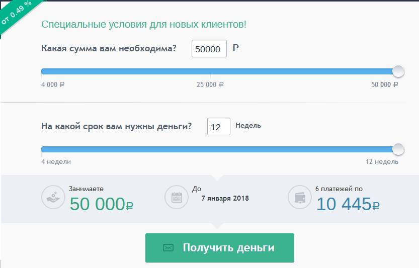 - при достижении лимита более чем в 30 000 рублей, Вам становится доступен заём с оплатой два раза в неделю и сроком от 6 до 20 недель.