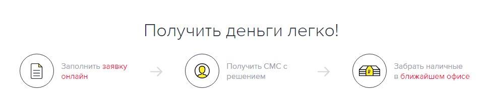 Оформление заявки происходит на сайте компании с подтверждением по сотовому телефону или через электронную почту клиента. Время рассмотрения в среднем 3–15 минут, после одобрения и подтверждения заявки деньги поступают в считанные минуты.