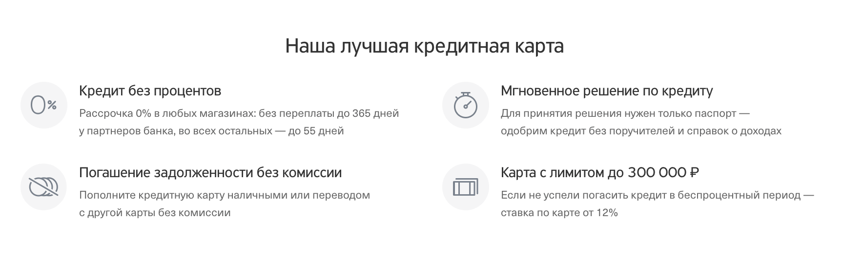 | Льготный период | До 1 года – у партнеров, до 120 дней – при переводе задолженности из стороннего банка и до 55 дней – на остальные покупки |
