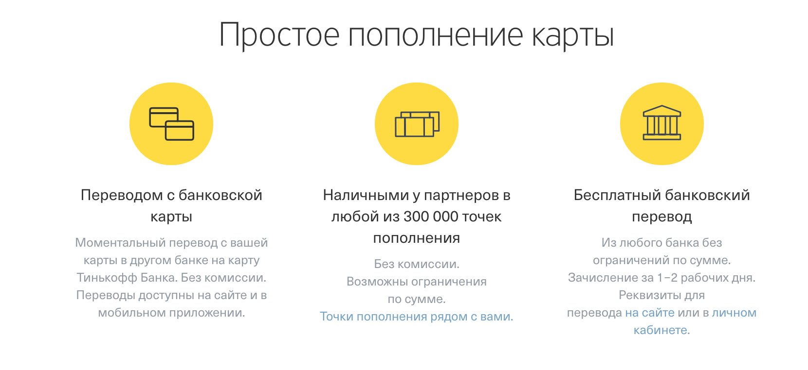 - бесплатный перевод денег на карточный счет на сайте и банкоматах Tinkoff, через мобильный банкинг и в сервисных пунктах партнеров;