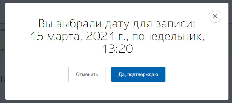 Выбираете удобное время, появляется окошко подтверждения записи. Подтверждаете действие: