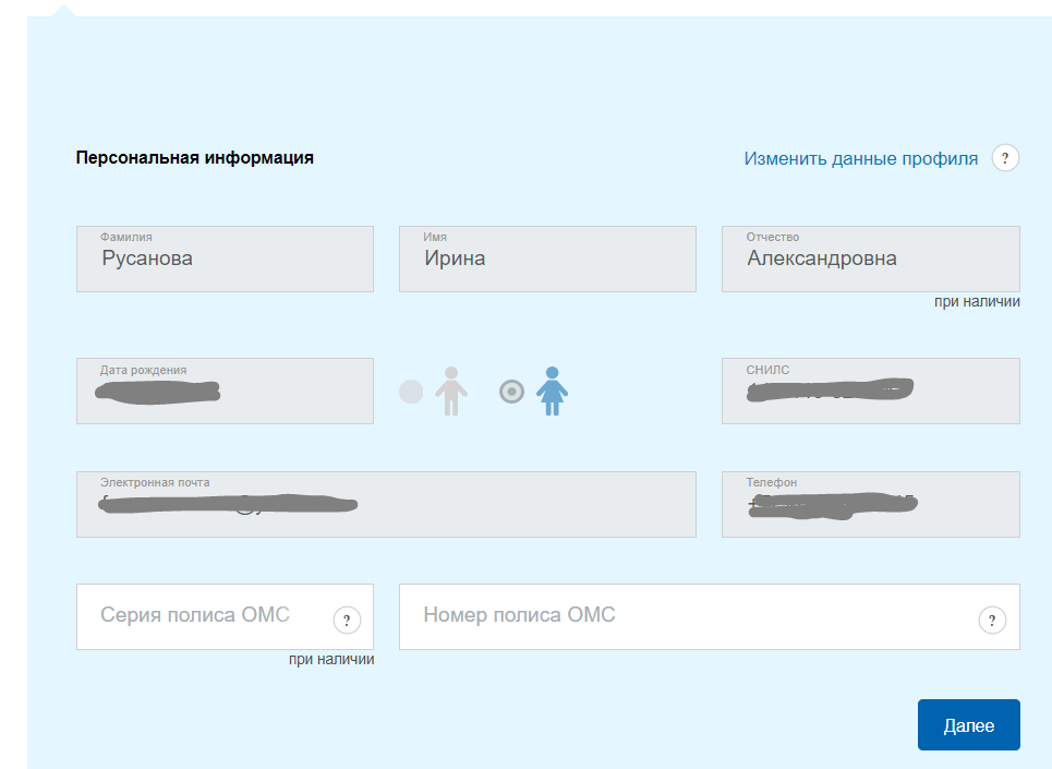 Указать регион и кто записывается на прием. Если сам авторизованный пользователь, его данные уже будут внесены (могут попросить только ввести номер полиса ОМС). Если записываете другого человека, следует ввести его данные и нажать “Далее”: