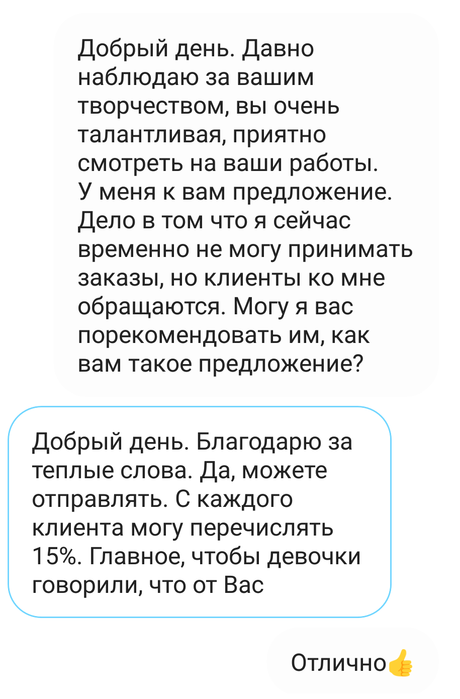 Иногда у меня, как у швеи бывает аврал заказов, что приходится отказывать в пошиве обратившимся ко мне клиентам. Признаюсь честно, я довольно долго давала реальным покупателям от ворот поворот, пока не пришла идея, как извлечь из своего отказа выгоду. Дело в том, что те люди которые ко мне обращаются за индивидуальным пошивом — это не просто покупатели с улицы, это клиенты, которые мне доверяют. Поэтому, когда я им говорю, что у меня сейчас нет возможности принять их заказ, но я могу порекомендовать высококлассную швею, которая сошьет им платье не хуже меня, они с радостью хватают это предложение. А мне остается лишь найти коллегу по цеху и договорится с ней о том, что я буду отправлять к ней клиентов за небольшой процент от заказа. Посмотрите — эти сообщения реальный случай из моей практики.